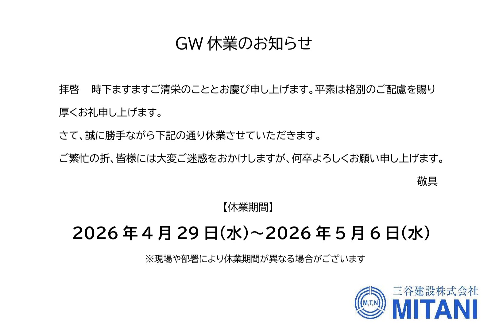 トップページ新着情報一覧 > GW休業のお知らせ